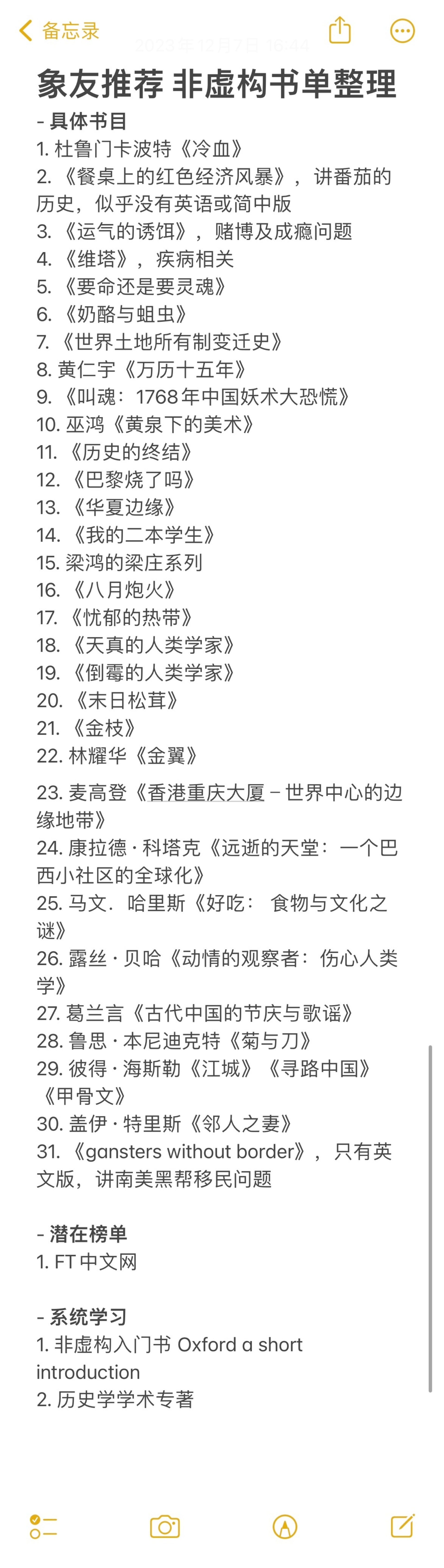 我某天突发奇想,想恶补一些人文历史方面的知识,想看一些非虚构作品,于是在版聊问了象友。这份书单是根据象友们的回答整理的,在顺带在这里也贴一下。