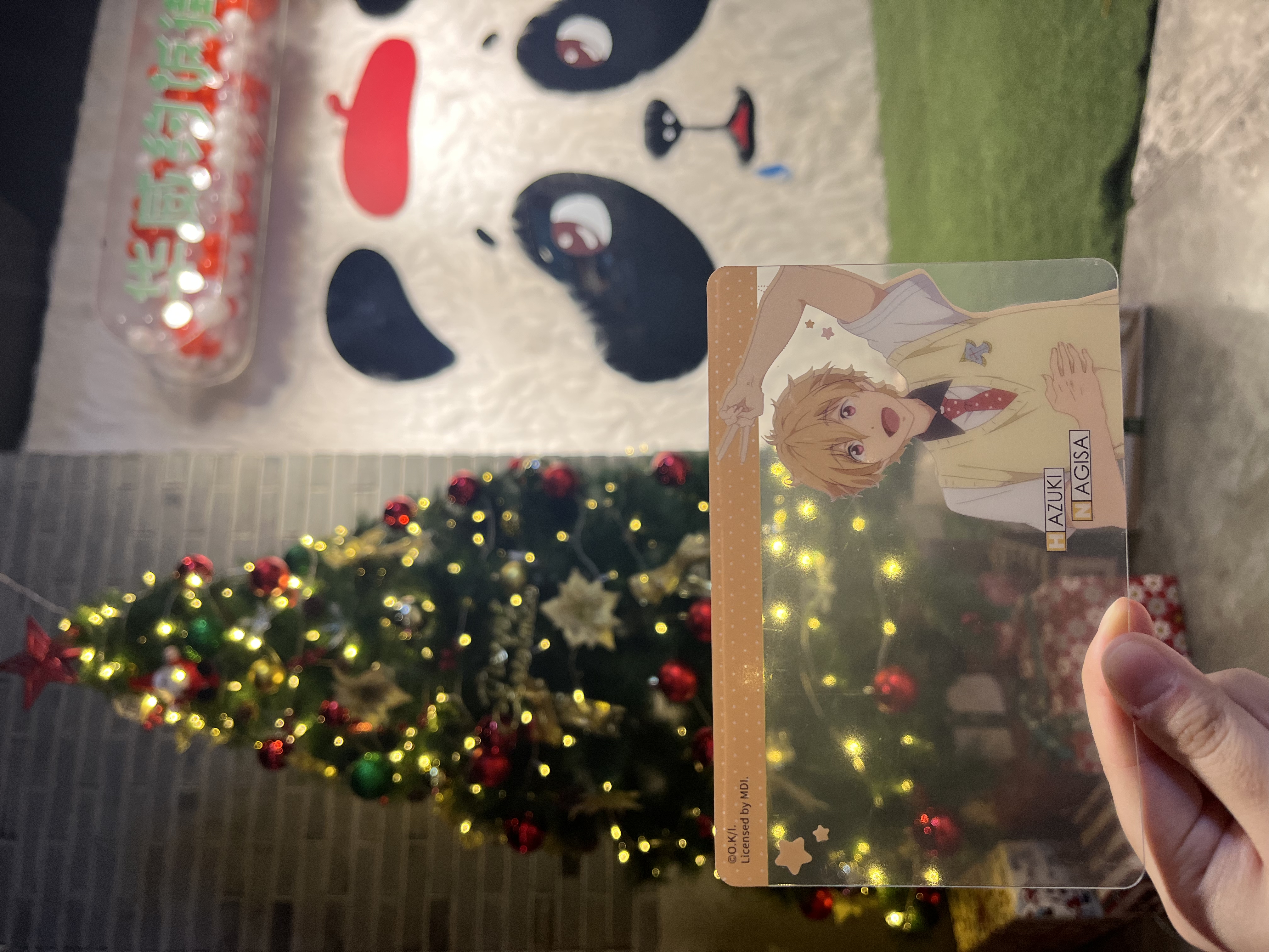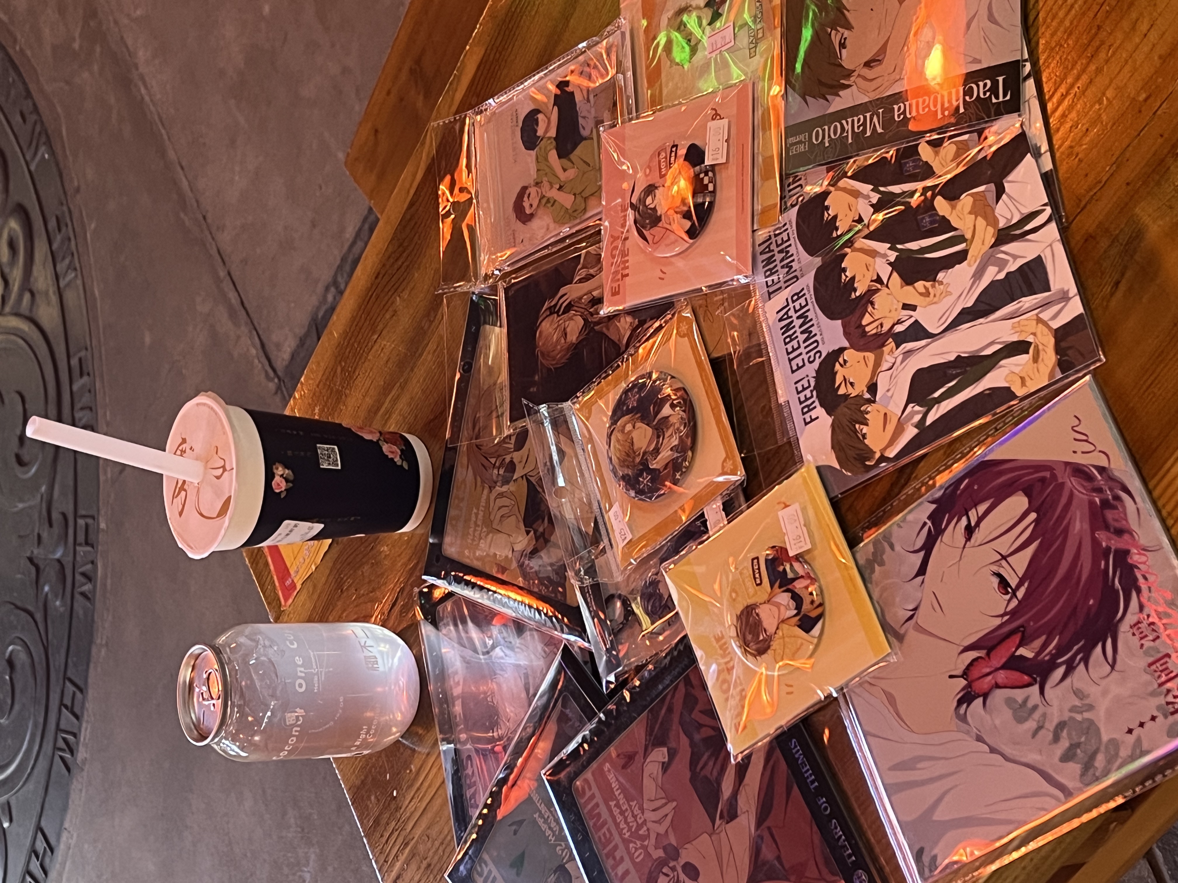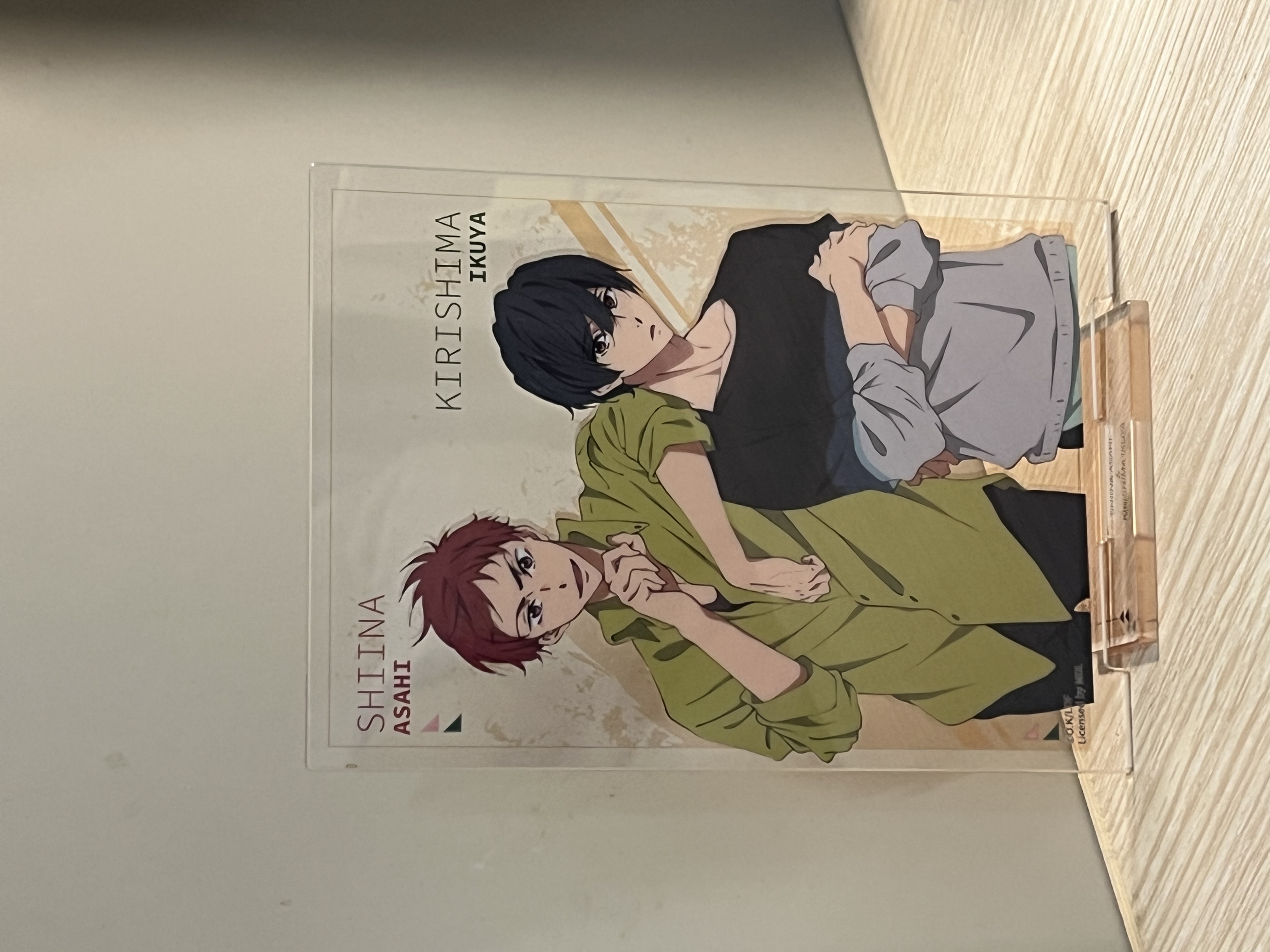《free!》的谷子很多,而且绝大多数选图都很美。因此我在B站买了五个吧唧后,又借着本科室友也入坑《free!》的契机,和她一起在大雪天出门冲到谷店,购入明信片两张、透卡一张、亚克力立牌一个。第一次体会到吃谷的快乐,完全是看宝宝的心情,无论拍什么照片都想把它也放进照像框内。亚克力真的太美了我要多买亚克力。